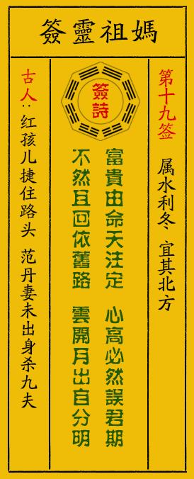 | 诗曰 | 富贵由命天注定、心高必然误君期、不然且回依旧路、云开月出自分明。 |