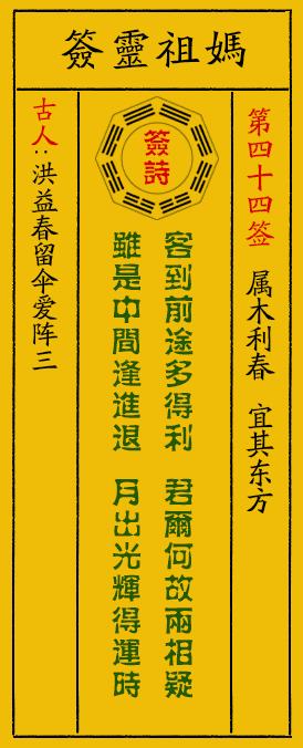 【台湾北海观音明善堂】贵人已来到你的眼前了,将来的发展也会获益很多,为什么还要猜疑呢?虽然还是有进退维谷的时候,也不必灰心,云开月出,光耀普照的时机马上来到了。认为对的人事物,就不要轻言改变。求得此签暗示有神缘,问事求谋,会得神明相助,不须疑虑心急。凡事先凶后吉,先难后易之兆。问求财,目前浮沉不定,但未来利润大有可观。问功名,此科无望,后科得中。问婚姻,阻碍扫除,有情人终成眷属,不要灰心。问诉讼,虽有冤枉,终得平反。凡事虽有困难,如能克服,可获成功,而每在月中有转运的迹象。问疾病,求神平安。 【台湾育德妈祖同修会】客人来了,未来的发展,利益多多,你们为什么要互相猜疑呢?虽然是进退维谷的时候,也不必灰心,云开见月出的时机马上到来。抽得此签,乃先凶后吉、先难后易之兆。问求财,目前浮沉不定,但未来利润大有可观。问功名,此科无望,后科得中。问婚姻,阻碍打开,有情人终成眷属,不要灰心。问诉讼,虽有冤忘枉,终得平反。曾有某侨生,欲回侨居地,因签证发生问题,进退维谷。抽得此签,佘曰:“月中可行。”后果然于月半过后,即获解决,正应了第三、四句签诗。此签问谋事,虽有困难,如能克服,终得成功。而多于月中有转运的迹象。 |